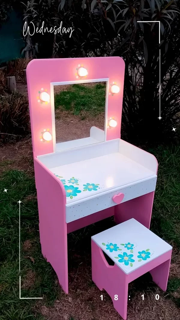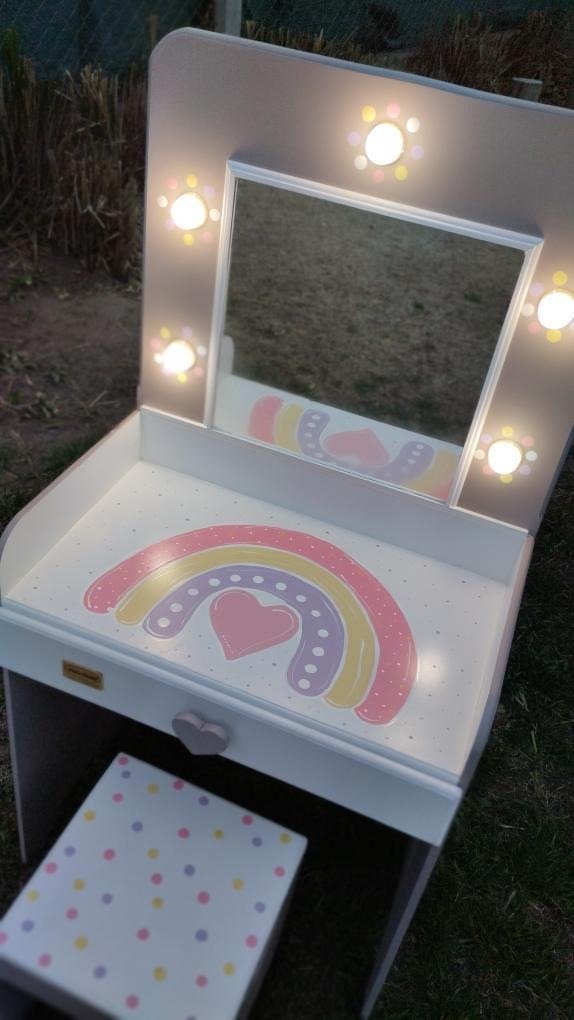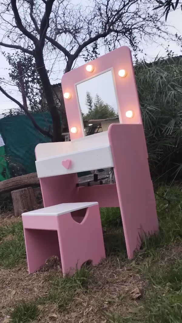 Con LUCES !! 💡tipo camarín y un espejo real 🪞 se transforma en el escenario perfecto para todas sus aventuras frente al espejo 💄Incluye un CAJONCITO amplio para guardar accesorios, vinchas, bijou o tesoros favoritos.👑👛👓
