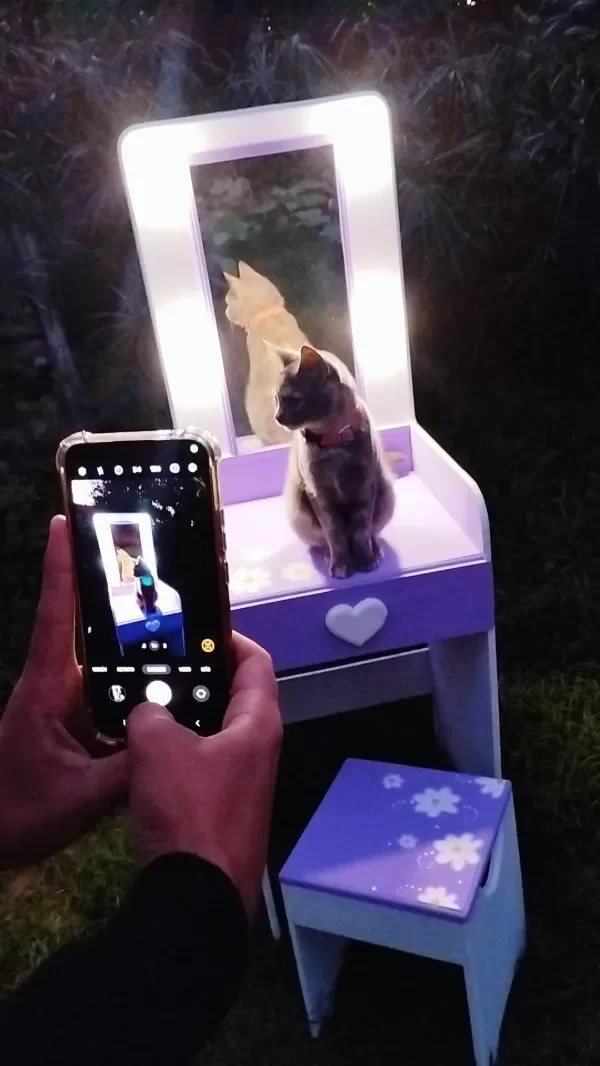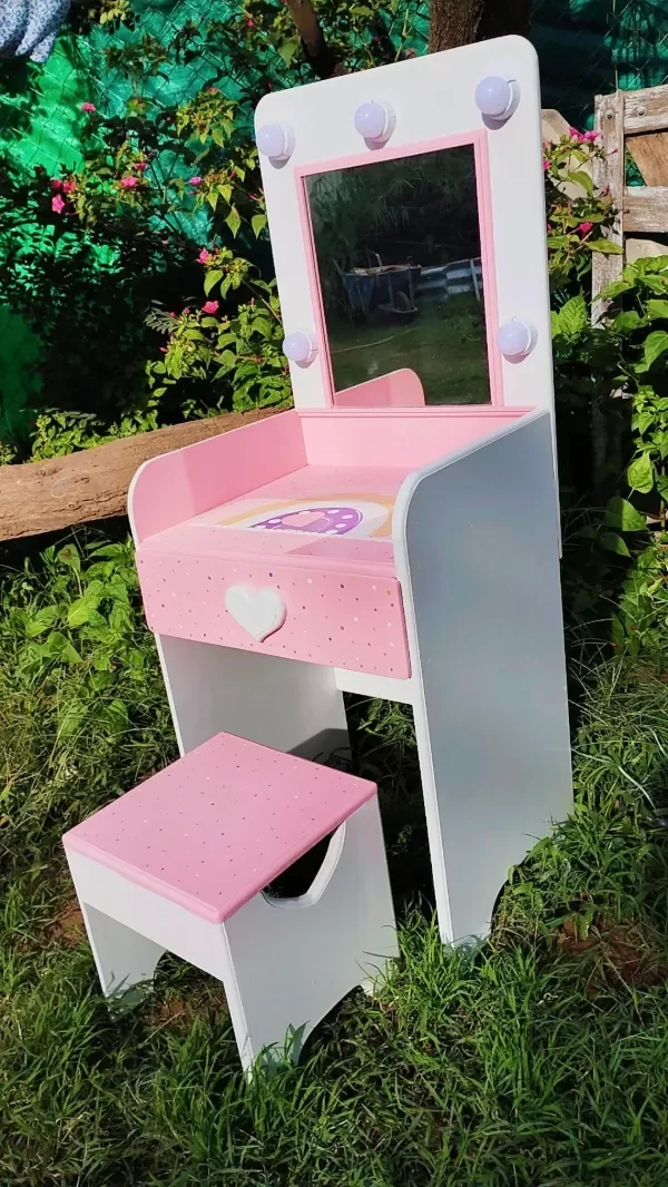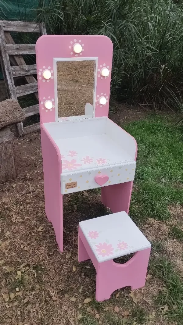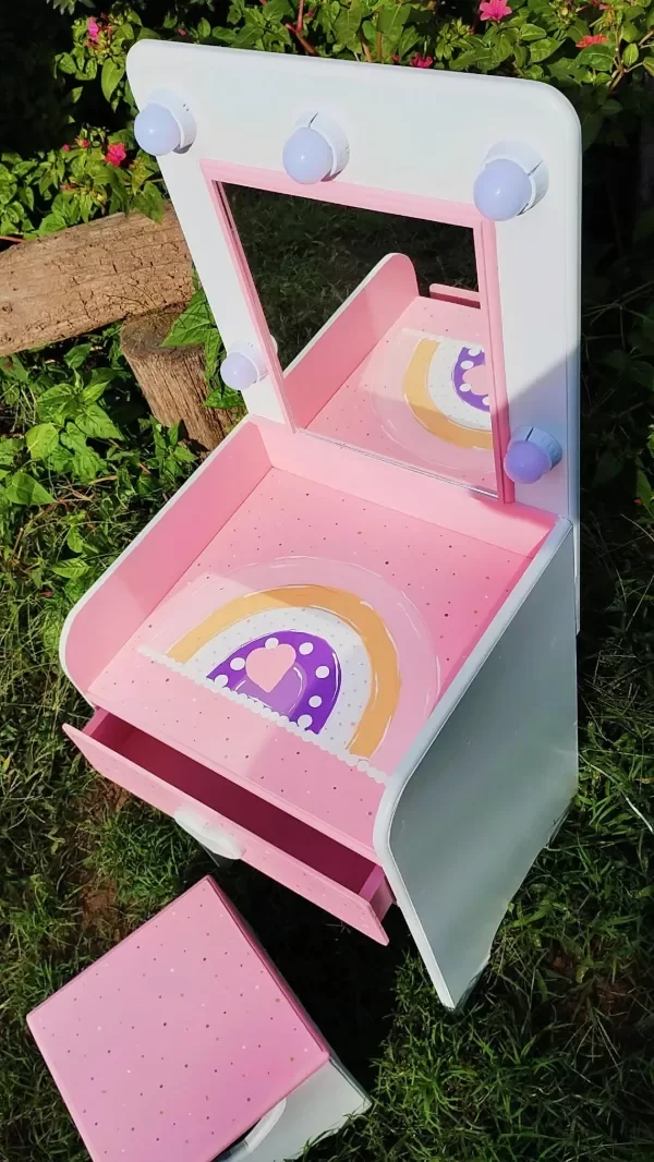 💡Con LUCES 💡 tipo camarín y un espejo real 🪞se transforma en el escenario perfecto para todas sus aventuras frente al espejo.👑 Incluye un CAJONCITO amplio para guardar accesorios, vinchas, bijou o tesoros favoritos.💄👛👓